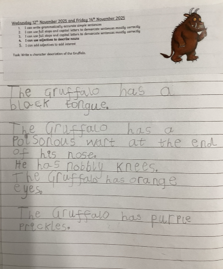 Class 3: Sofia for working really hard on her Gruffalo description. She paid close attention to full stops and capital letters and recalled the key physical features of the Gruffalo really well.
