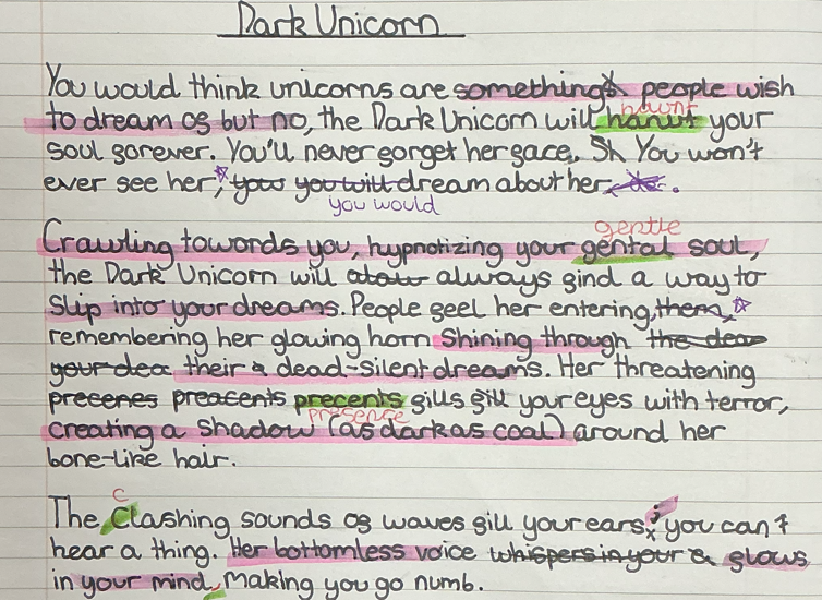 Class 13: Maya for her description of a mythical creature. She used a range punctuation and grammar, along with some interesting vocabulary choices to create an eerie atmosphere.